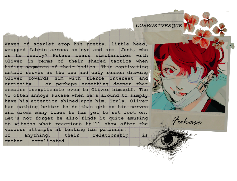 One of the first Vocaloids aside from Fukase to ever form a friendship with Oliver out of their own will. They both had met one fated, quiet night when the Wolfloid sought aid and guidance as to where the famous Vocaloid Manor is located. Due to one sided nasty behavior on Olivers' behalf, misunderstandings arose however throughout their walk to the Idol residence it was managed to be cleared up and forgiven but not forgotten.