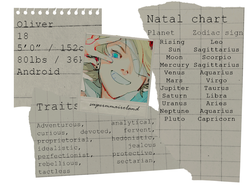 Why Oliver covers his left eye is unknown to the public. You’ll have to find out yourself! As for the left foot and above his right knee, the skin there is horribly deformed—showing off his endoskeleton. Why is it deformed? Another detail left as a mystery. He chooses to cover it so he can surprise others by revealing it out of the blue as a sort of prank.