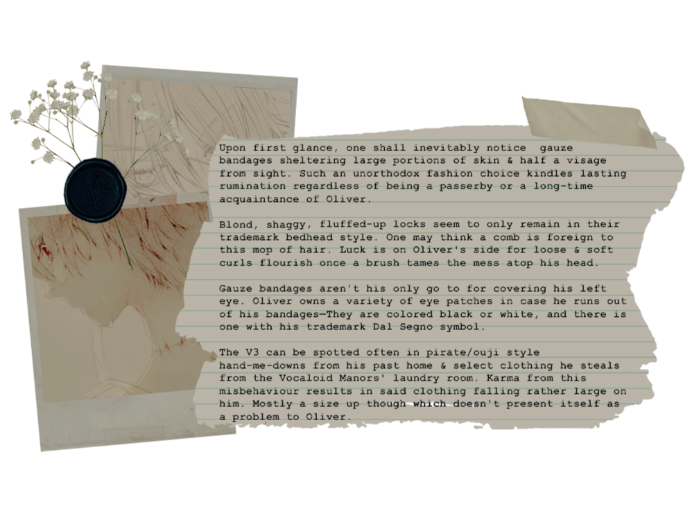 PFX-VOCA03 was designed && created by PowerFX Systems AB in Stockholm, Sweden. The story given to him for sales is a mere choir boy thrown into the digital world of Vocaloids. With his charming child-like appearance and fabricated backstory, it was no surprise that this unit was marked purchased and listed for shipping to alias E.B. In the United Kingdom so quickly. The alias was the only piece of information Oliver was aware of before being sent away. Despite such little knowledge of his future owner, Oliver was overjoyed to know he would finally be put to effective use.